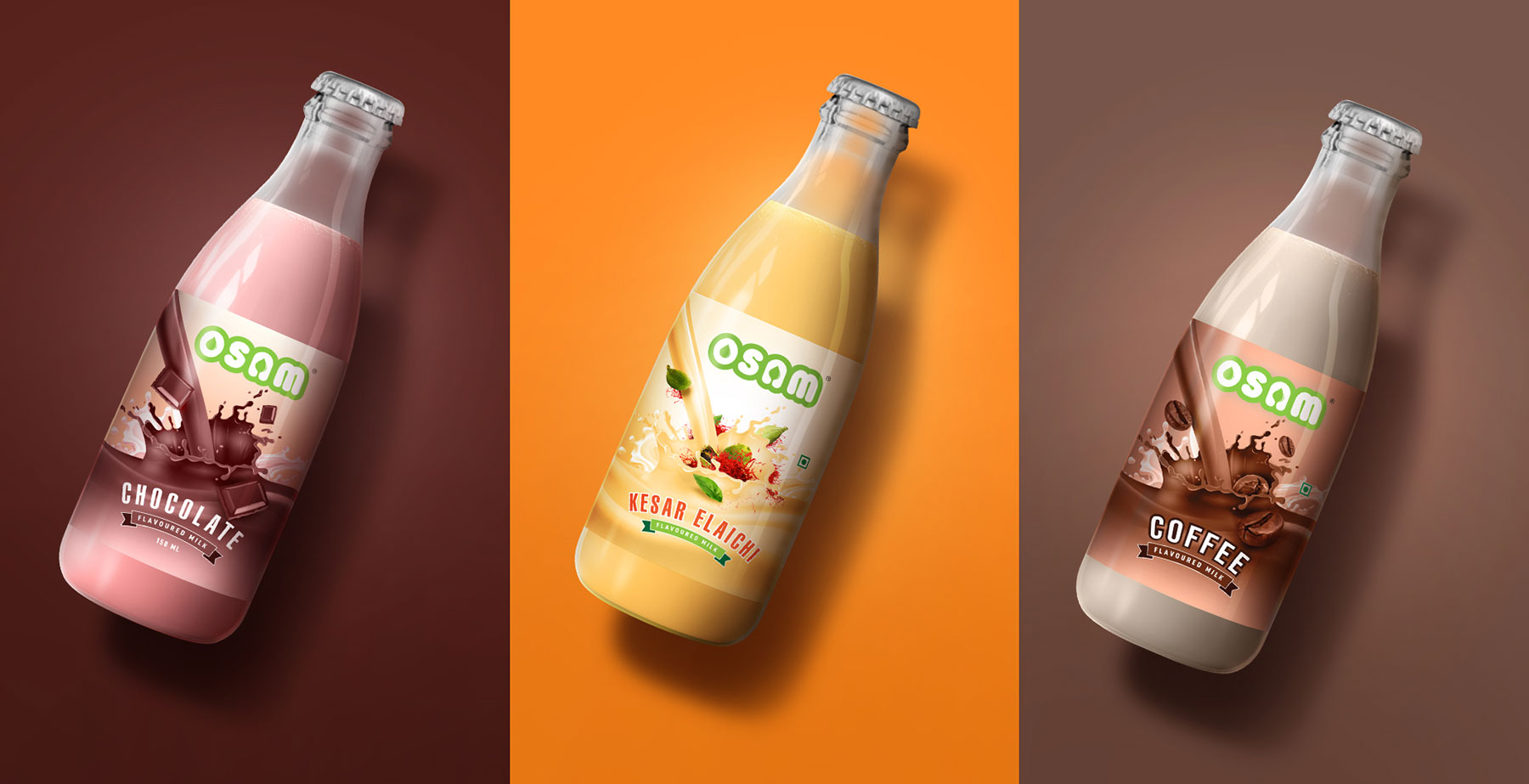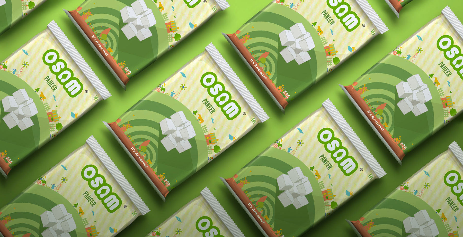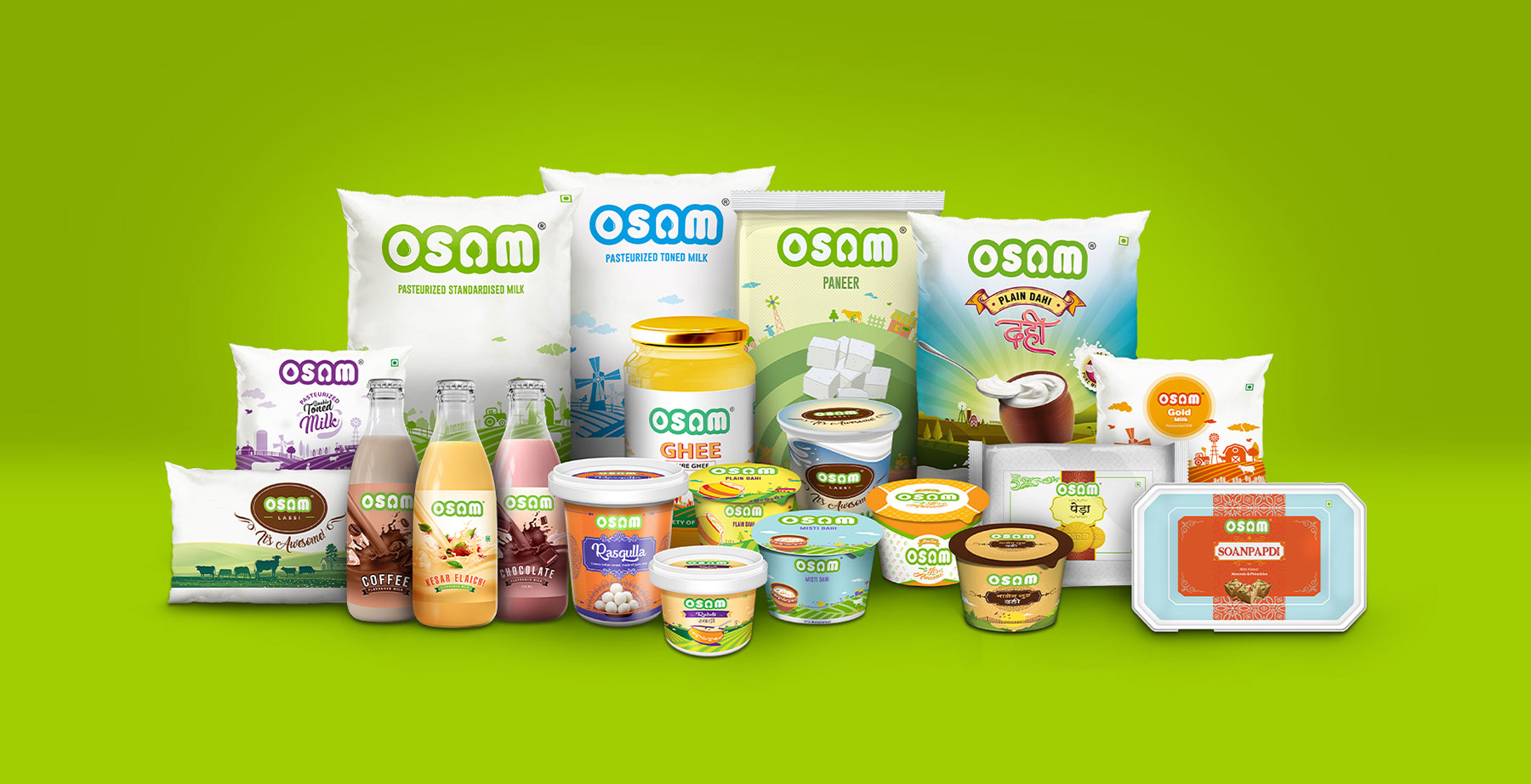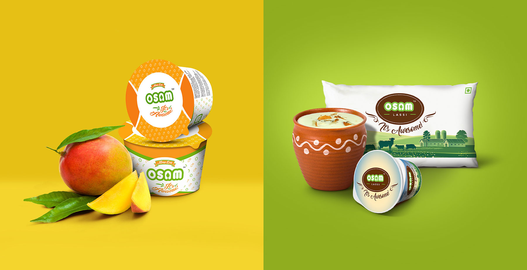 Osam is an honest effort made by a team of young, energetic professional entrepreneurs to provide high- quality dairy products to the customers in the state of Jharkhand. They collaborated with us for the packaging of a variety of its milk and yoghurt product range that includes Mango dahi, lassi, Rose-flavoured lassi, Masala buttermilk, Osam special milk, sweets, etc. We gave clear themes and colours for each product category and variant. We chose images and graphics to clearly represent the product description, like the orange and white colour theme for Mango-flavoured dahi, with the image of fresh mangoes. For Rose-flavoured lassi, we picked pink & white colours to signify roses & lassi with a background image of a farm with roses. For plain lassi, we chose the green colour for farm and white for lassi & purity with a background image of village & green farmlands with cows & farm animals. For plain milk and buttermilk, we kept it simple with images of farmland, clay pot with the white & brown background to signify pure unadulterated milk.